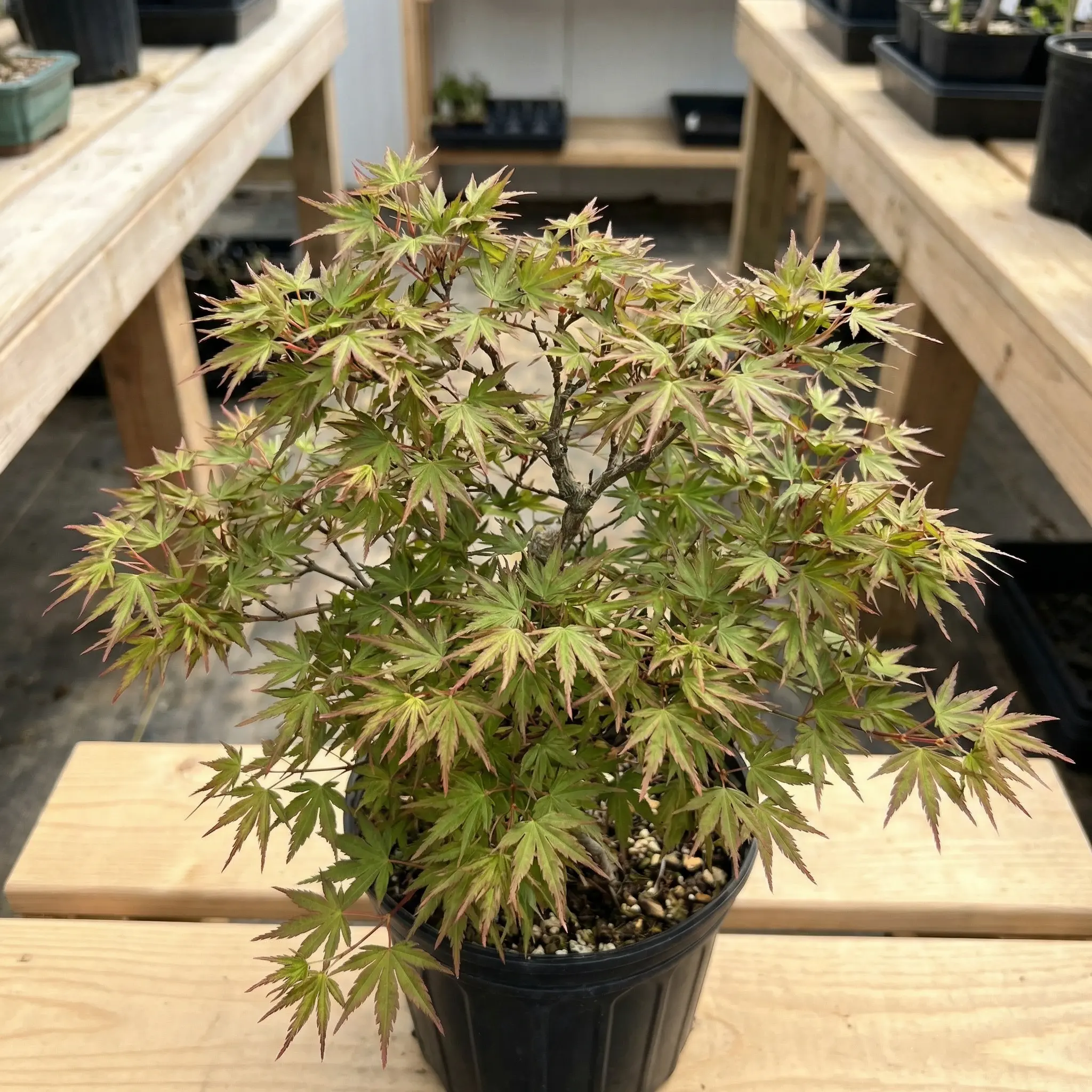 Acer palmatum Ori hime fine narrow leaf detail on young pre-bonsai