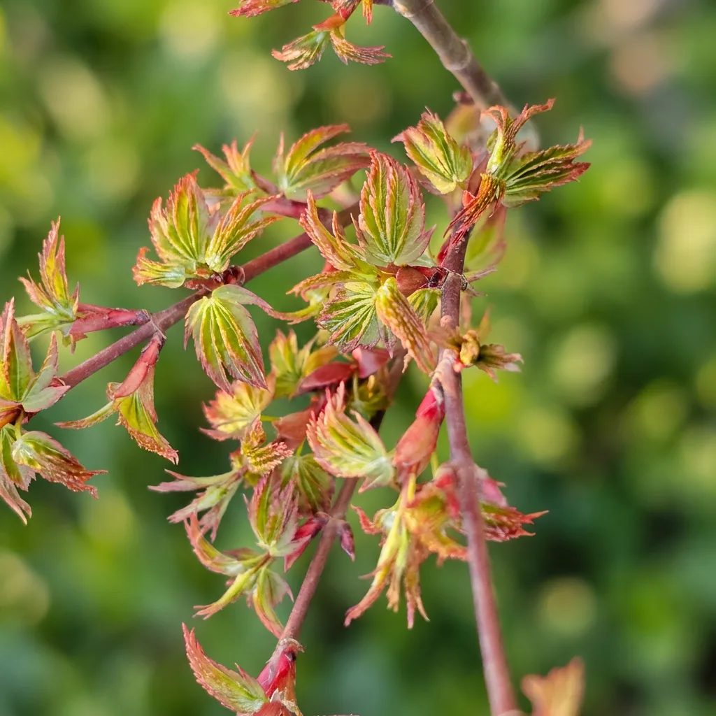 Acer palmatum Sei Hime spring buds emerging with pink and green tones